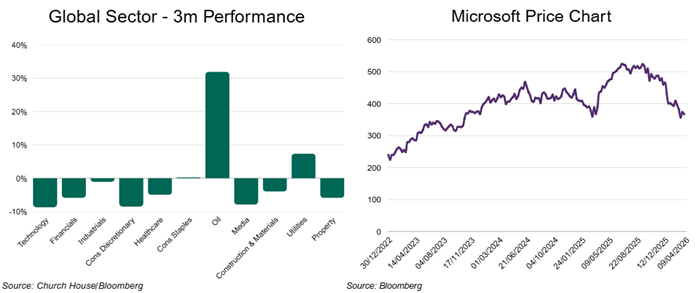 Semiconductor stocks and the wider technology sector were the primary driver of market returns in 2025 and this has become a more nuanced picture of late. Shares in semiconductor bellwethers Nvidia and Broadcom have paused for breath, unable to break to new highs despite excellent recent results, but the biggest moves have been in the software space. While investors spent 2025 enthusing about the growth opportunities around AI, 2026 has seen the mood sour, instead focusing on perceived AI losers. There were a feverish few weeks in the quarter where the investors were climbing over each other to exit their software stocks, sending the whole sector down, even the likes of Microsoft were not immune, with shares down 23% in 3 months. The market has since begun to pick through the bones of this indiscriminate sell-off, albeit these names remain soundly beaten-up.