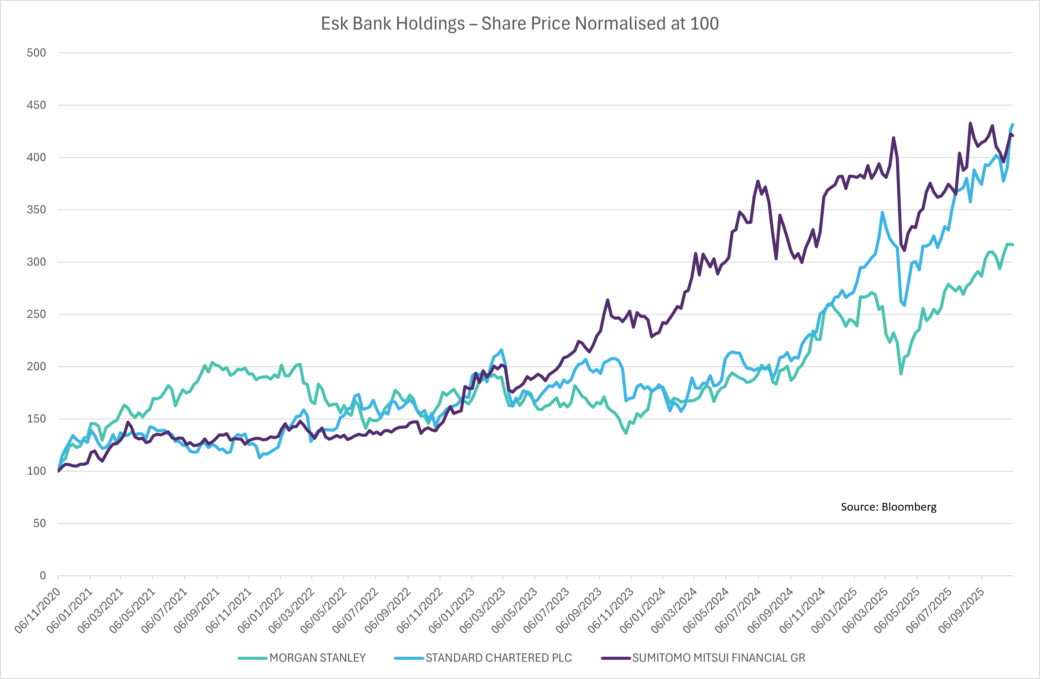 In addition to Alphabet, all our US mega-cap tech stocks continue to power ahead – Microsoft, Apple and Amazon are all at (or close to) all time highs. This is a momentum driven market and the same has been the case for our bank holdings, from Standard Chartered, to Sumitomo Mitsui, to Morgan Stanley, the steady march higher of their share prices has been remarkable. If one had told an investor back in the decade leading to 2020 that banks would be so in vogue, you would have been laughed out the door. See the chart across.