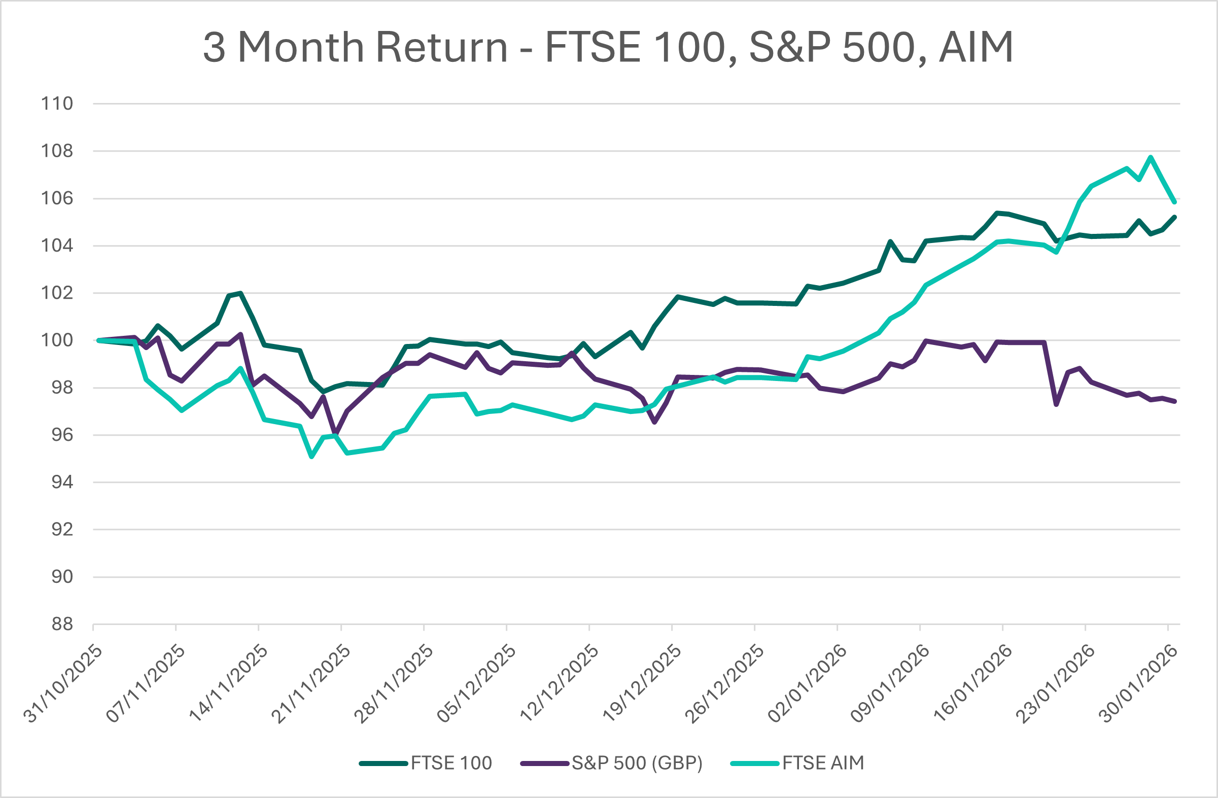 Against this backdrop one equity market that has quietly been making a comeback is the UK. The FTSE 100 rose 2.9% in January and, even more astoundingly, UK smaller companies are doing even better, with the FTSE AIM up 6.7% over the same period. Whisper it quietly, but Gilts have been relatively steady on a global basis (unlike Japanese bonds) and credit spreads remain tight. Could this be the year for investors to stay closer to home (at last)?